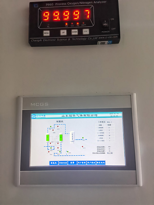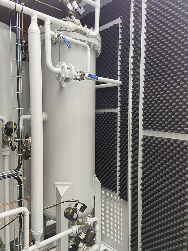 給客戶推薦使用制氮機現場制氣,經過與客戶反復討論,決定利用現有空壓機的富余氣量。現有空壓機建設工廠時選型過大,有1/3的壓縮空氣余量,經過詳細的計算,根據富余氣量及壓力給客戶配套相應型號的制氮機,純度99.99%。設置液氮切換系統,一旦制氮機有異常故障,瞬時切換到液氮氣站管路供氣。